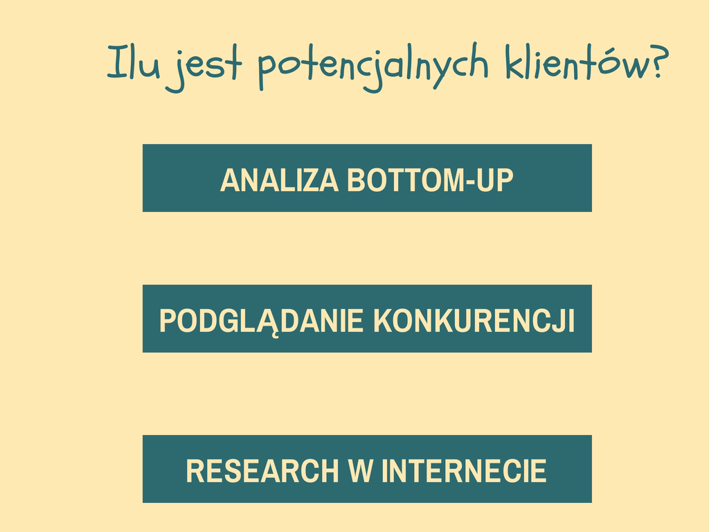 - Analiza bottom-up polega na wyjściu od ogólnych liczb obrazujących stan wiedzy na temat danego regionu lub dla danej grupy, które są w miarę sprawdzalne i uogólnieniu ich dla całego kraju / grupy klientów. W naszym przypadku trzeba by policzyć lokale franczyzowe w danej dzielnicy / mieście i mając liczbę mieszkańców na tym terenie uogólnić to na całą Polskę. Tak, wiem metoda bardzo ogólna, ale w ciągu pół dnia masz dobrze oszacowaną wielkość potencjalnego rynku. Tutaj znajdziesz przykład analizy bottom-up: