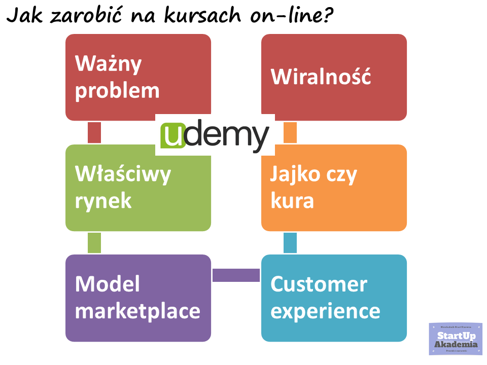 „Jajko czy kura”. Na samym początku nauczyciele nie chcieli korzystać z platformy, bo wiedzieli, że nikt nie korzysta z Udemy, zaś uczniowie nie mieli, po co wchodzi na stronę, bo niewiele kursów było dostępnych. Problem ten potocznie zwany chicken-egg-probem nawiązuje do dyskusji na temat tego co było pierwsze: jajko czy kura? Udemy wymyśliło parę sposobów jak obejść ten problem i zapewnić sobie dość wcześnie minimalny wybór kursów. Po pierwsze zassali kursy z innych platform. Po drugie, przekonali paru nauczycieli by wykorzystywali Udemy jako narzędzia do nauki własnych studentów. Po trzecie, zainicjowali parę eventów, które filmowali i z których później zrobili kursy on-linowe. Po czwarte, przekonali Jacka Welcha by umieścił swój kurs MBA na ich platformie. By z kolei przyciągnąć studentów dość dużo korzystano z Grouponów i innych marketpalce typu daily deals i mocno skupiali się na newsletterach. Dobremu postrzeganiu marketplace sprzyja również używanie dowodów społecznych. W przypadku Udemy każdy kurs nie tylko ma oceny, ale są również pokazane pobrania co potwierdza jakość kursu i jakość platformy.