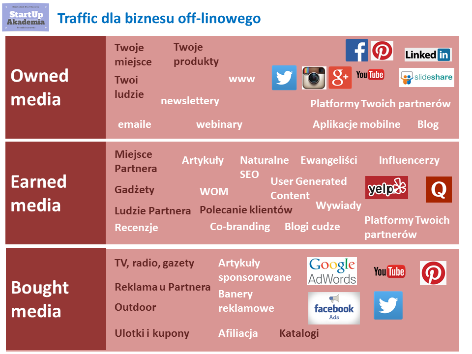 Sposoby pozyskiwania trafficu możemy podzielić na 3 grupy: onwned media, earned media i bought media. Poniżej w takim podziale opiszemy, co można jeszcze dodatkowo robić, gdy Twój biznes jest dla klienta fizycznie namacalny.