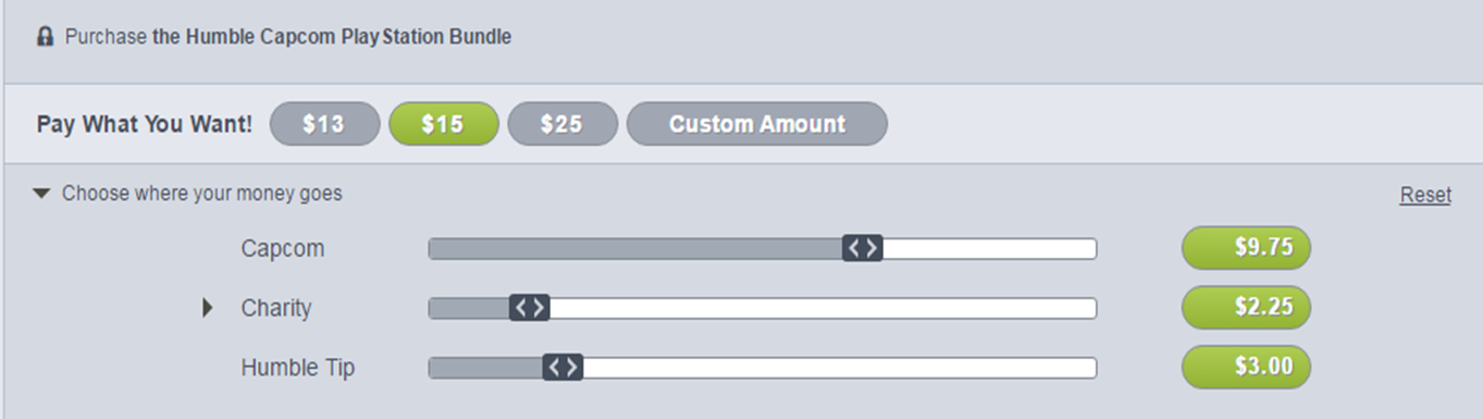 Pay what you want. Główna innowacja Humble dotyczy tego jak ustalana jest cena. W ich modelu to konsument ustala ile chce zapłacić. Co więcej ustala też, na co idzie jego płatność. Jest ona dzielona przez kupującego między twórcę gry, Humble Bundle i wybrany cel charytatywny. W ten sposób jesteś w stanie zebrać dokładnie tyle ile produkt jest wart dla danego klienta – marzenie każdego marketingowca i mikro-ekonomisty (tzw. dyskryminacja cenowa) 🙂 Oczywiście nie zostawiają klienta samemu sobie i zawsze sugerują pewne poziomy cen lub też pokazują ile zapłaciła większość. Jedną ręką dajesz im pełną swobodę by drugą wskazać, że powinni się wstydzić jeśli dadzą mniej niż pewien pożądany przez Ciebie poziom 🙂 Humble Bundle dostaje średnio około 15% całości wpływów.