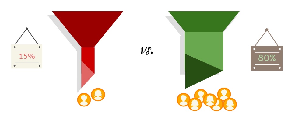 Duży potencjał zwiększenia sales velocity ma oczywiście ciągłe poprawianie konwersji. Większość badań wskazuje, że większy zwrot z zainwestowanego dolara daje poprawa konwersji niż pozyskiwanie nowego ruchu / leadów czyli wyciskanie tego co masz jest lepsze niż szukanie nowych przygód 😉 . Trzeba brać to z pewną dozą nieśmiałość bo mocno zależy to od branży 😉